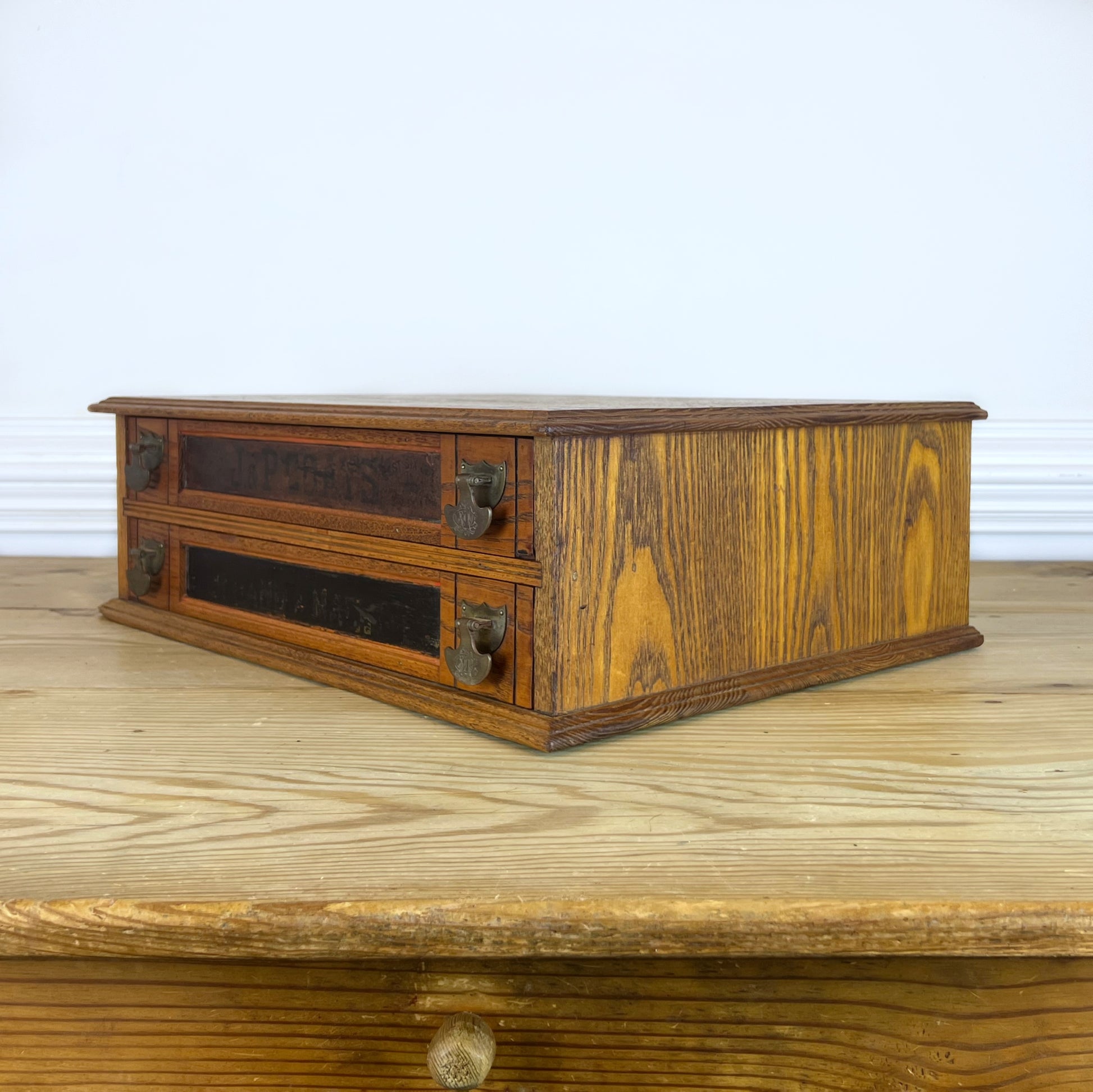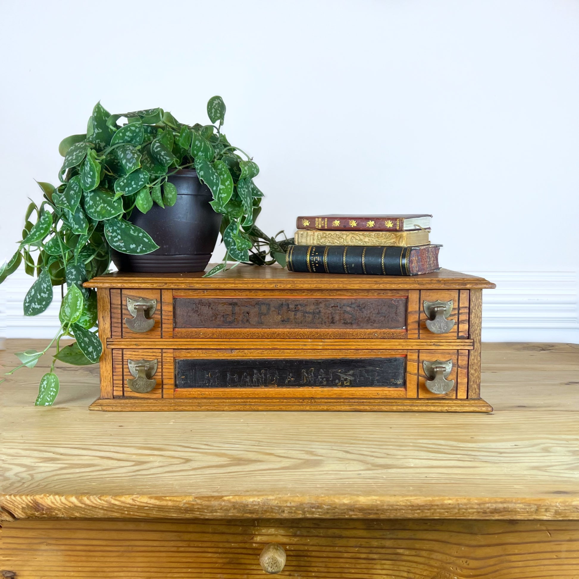 This authentic antique J. & P. Coats spool cabinet is crafted from solid oak, featuring two original drawers and a beautifully aged patina. These iconic Coats thread cabinets were originally used in general stores and sewing rooms to organize thread spools, and today they are highly sought-after antique sewing collectibles. This oak spool cabinet displays attractive wood grain, warm tones, and honest wear consistent with age, enhancing its vintage character. The two drawers slide well and provide practical storage for thread, sewing supplies, crafts, small tools, or collectibles. Its compact size makes it perfect as a primitive farmhouse décor accent, studio organizer, or retail display. A wonderful example of American advertising antiques and textile history, this J. & P. Coats cabinet works beautifully in a sewing room, craft space, antique shop, or as rustic home décor. Highly collectible and increasingly hard to find, this vintage Coats spool cabinet is both functional and decorative—an excellent addition for collectors of sewing antiques, store display cabinets, or farmhouse and primitive décor.