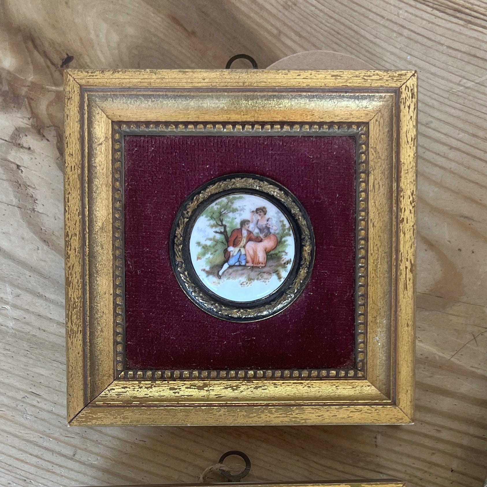 Vintage Porcelain Fragonard Courting Couple & Cameo Miniatures | Velvet-Lined Gilt Frames